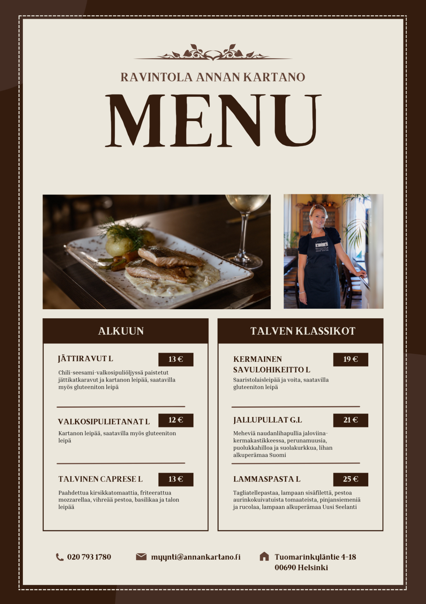 Ravintola Annan Kartanossa ruoka valmistetaan huolella ja kunnioituksella hyviä raaka-aineita kohtaan. Kaikki annoksemme tehdään alusta saakka omassa keittiössämme, rakkaudella sekä puhtaista ja tuoreista raaka-aineista.