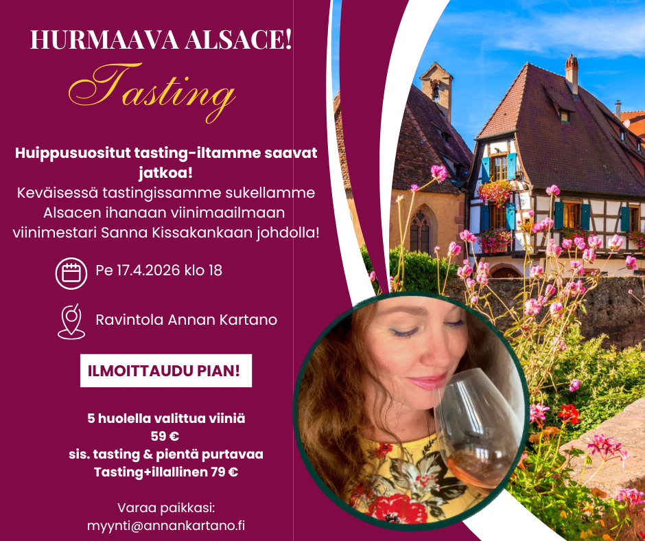 Tule mukaan viinimatkalle Alsacen herkullisten viinien äärelle viinimestari Sanna Kissankankaan johdolla. Makuelämyksiä ja inspiroivia tarinoita – täydellinen ilta viinien ystäville!