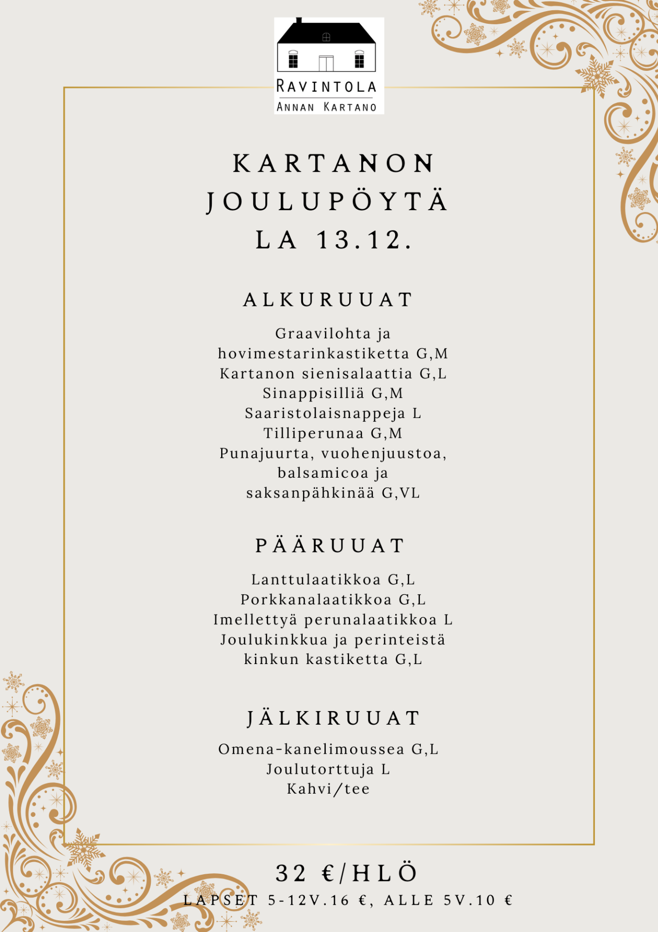 Tervetuloa virittäytymään joulun tunnelmaan ainutlaatuisessa kartanomiljöössä! Kartanon lauantain joulupöytä kutsuu sinut nauttimaan perinteisistä herkuista, lämpimästä tunnelmasta ja kiireettömästä yhdessäolosta – juuri kuten joulun kuuluu tuntua.